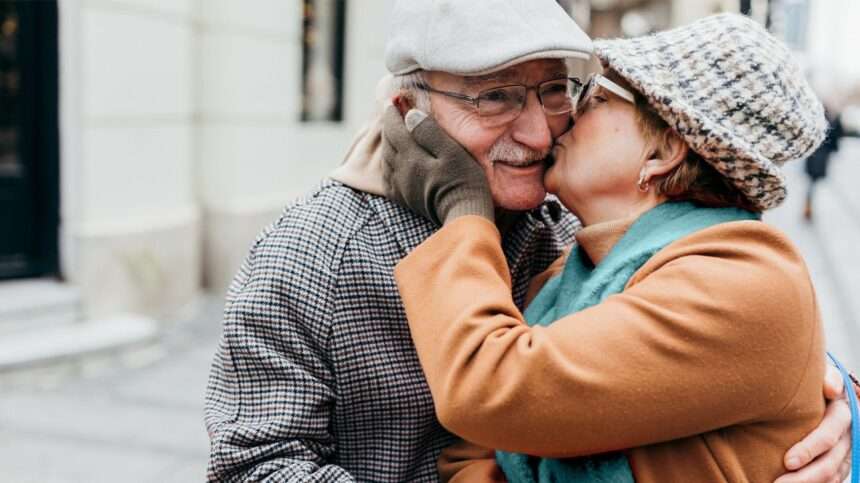 Older couple cuddling outside in a cityShare on Pinterest